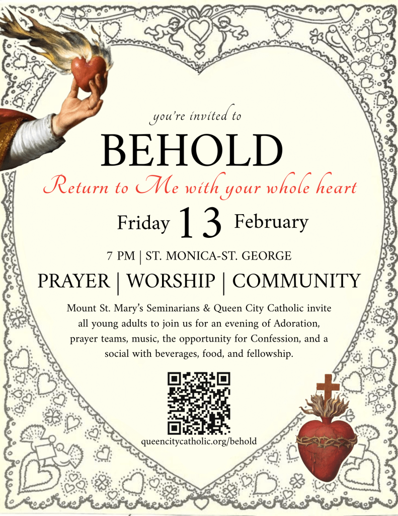 Behold is a time set apart to encounter Jesus Christ alongside other young adults in your community. Eucharistic Adoration begins at 7 PM, followed by the proclamation of the Gospel and a homily by one of our seminarian deacons. Let yourself rest in the presence of the Lord in the candlelit sanctuary, join in song and worship with the seminarian schola, bring your intentions to the prayer teams, and be healed by the loving mercy of God through the Sacrament of Reconciliation.
